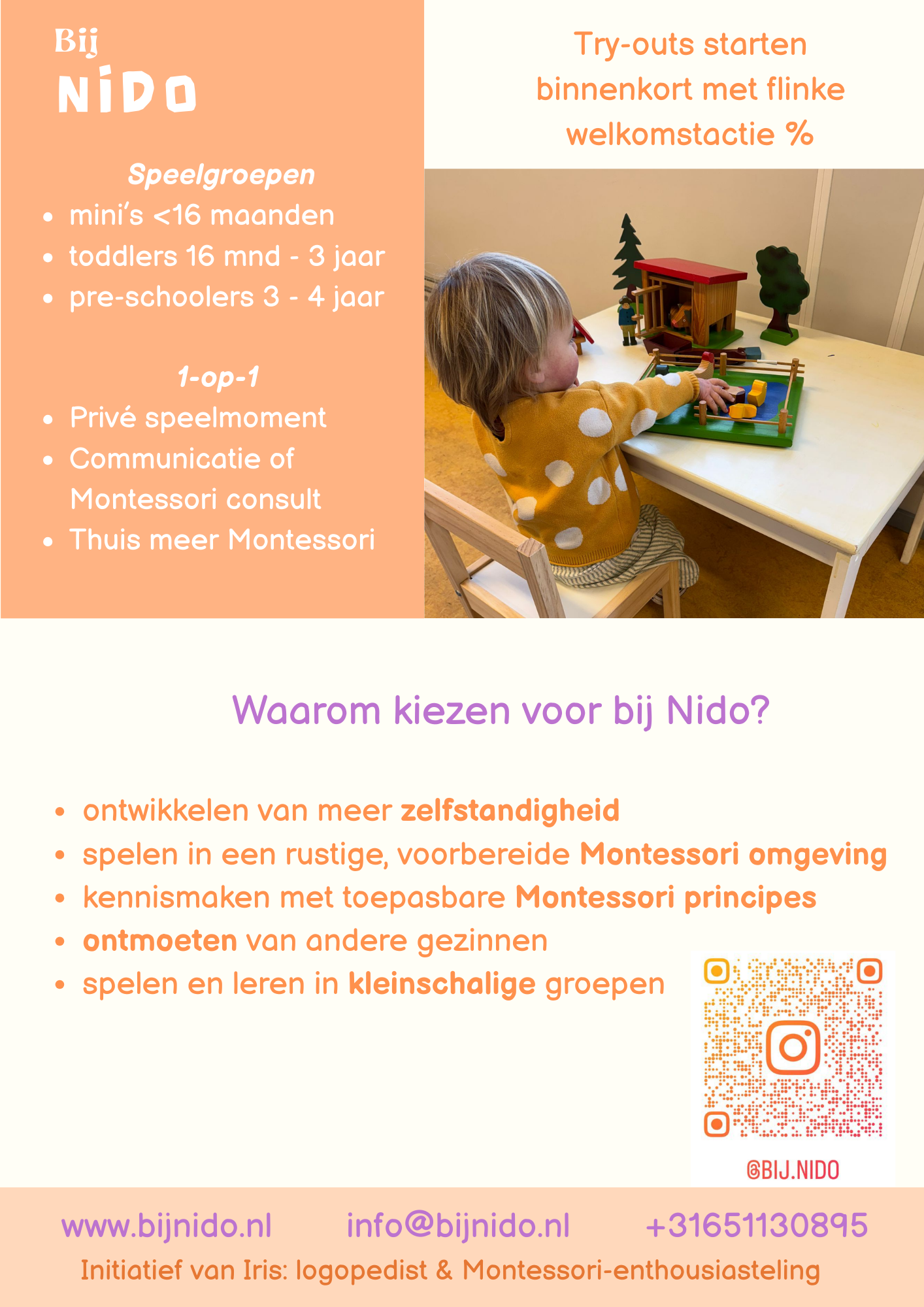 Bij Nido ontdekken kind en volwassene de wereld van Montessori. Er zijn verschillende ouder-kind speelgroepen van 0-4 jaar, 1-op-1 aanbod en workshops. Spelenderwijs zelfstandigheid ontwikkelen in een Montessori omgeving. Begeleid door Iris: logopedist en Montessori enthousiasteling!